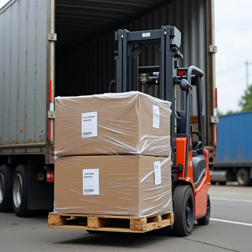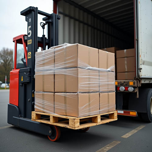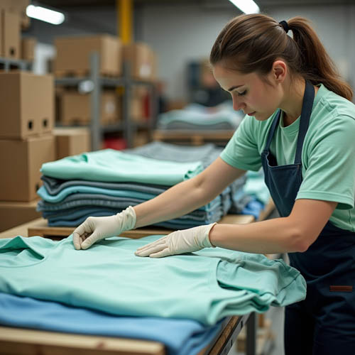 Final garments are boxed into the boxes they arrive in and pallatized for freight pickup, which is arranged by the customer.